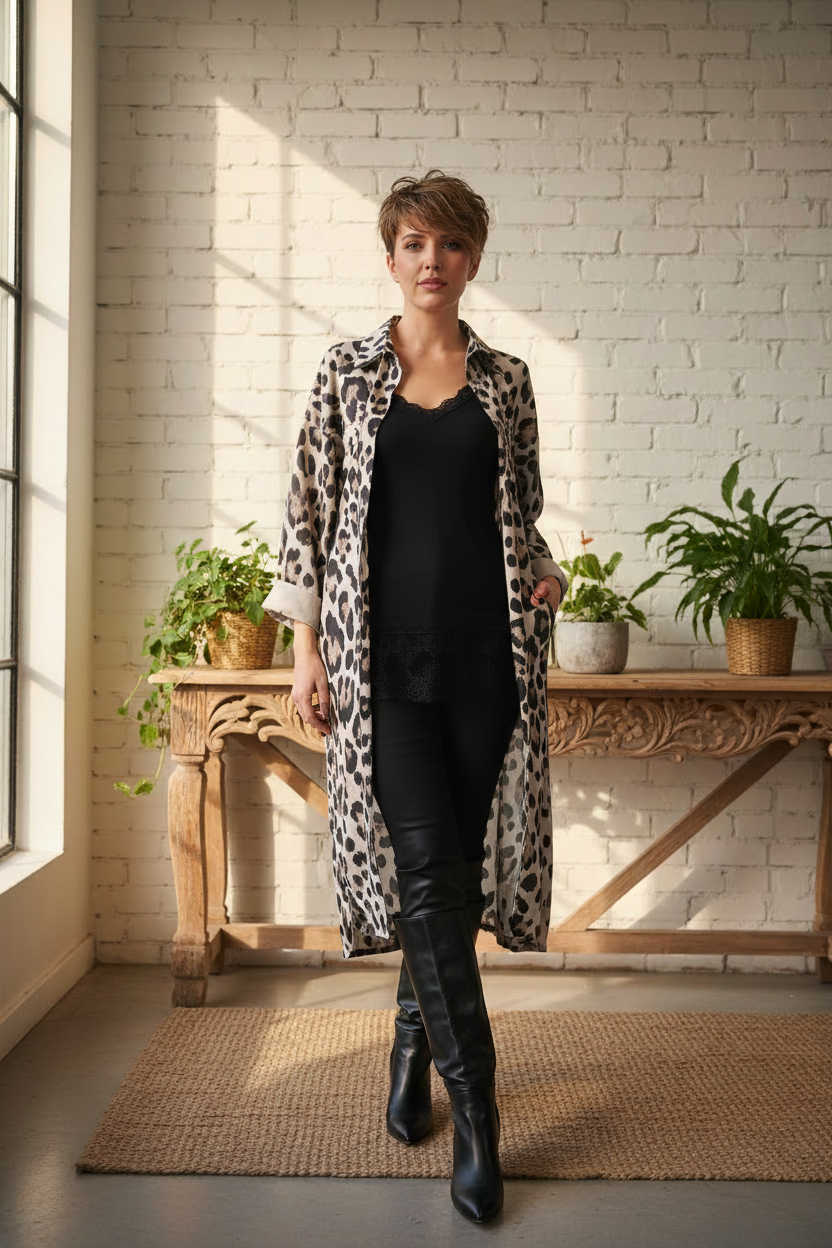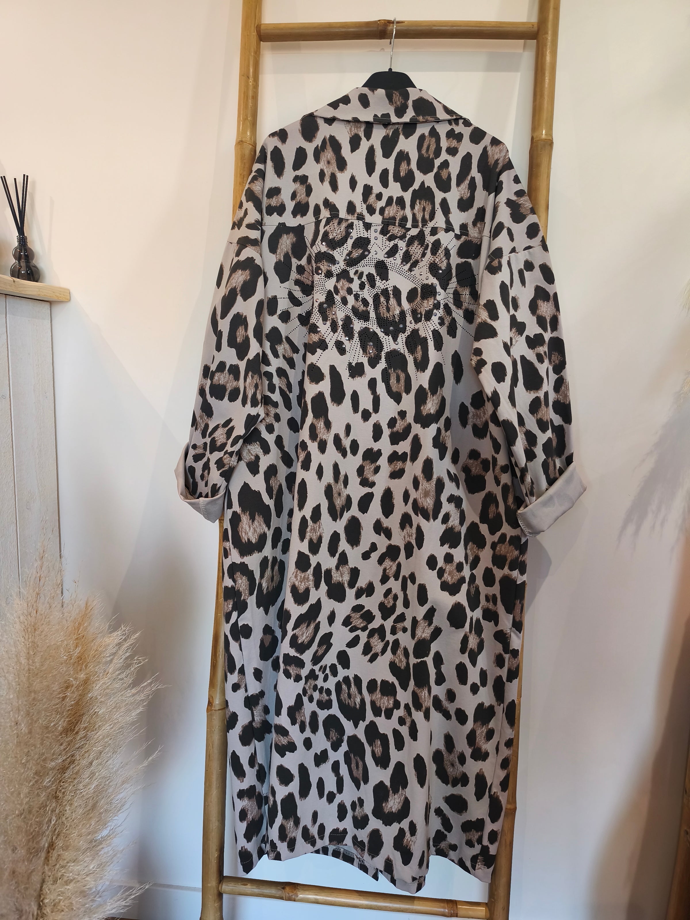 Découvrez la Robe Chemise Longue SYLVAINE, l'allié incontournable pour un style rock chic sans effort. Son imprimé léopard audacieux sur fond beige et son motif oeil en strass noir au dos apportent une touche sauvage et sophistiquée à votre garde-robe. Coupée en chemise fluide, elle épouse délicatement vos formes tout en offrant une liberté de mouvement absolue. Parfaite pour les journées comme pour les soirées, elle se porte seule ou superposée selon vos envies. Un basique réinventé qui capture l'essence du style éditorial moderne.