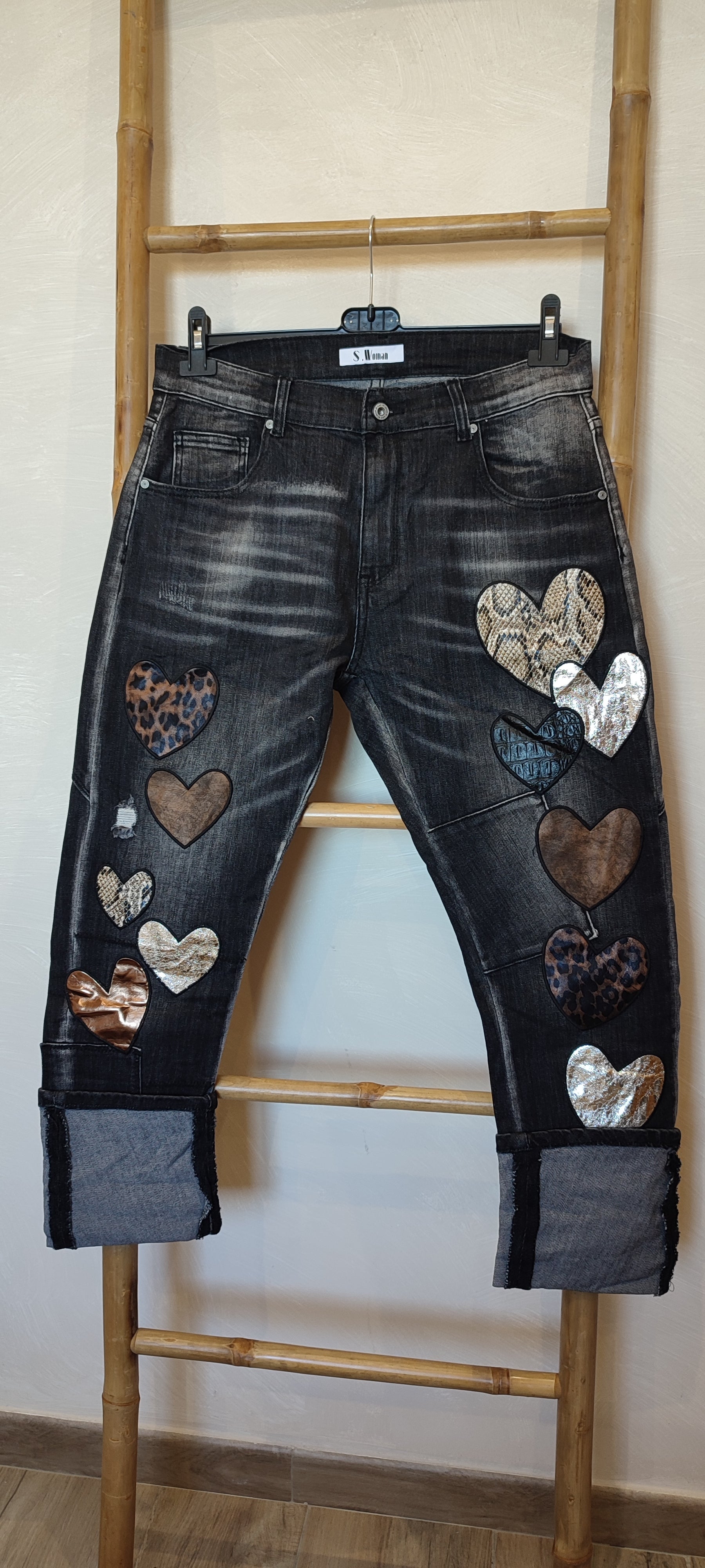 Jean Noir à Empiècements Coeurs Simili Cuir DAM'S