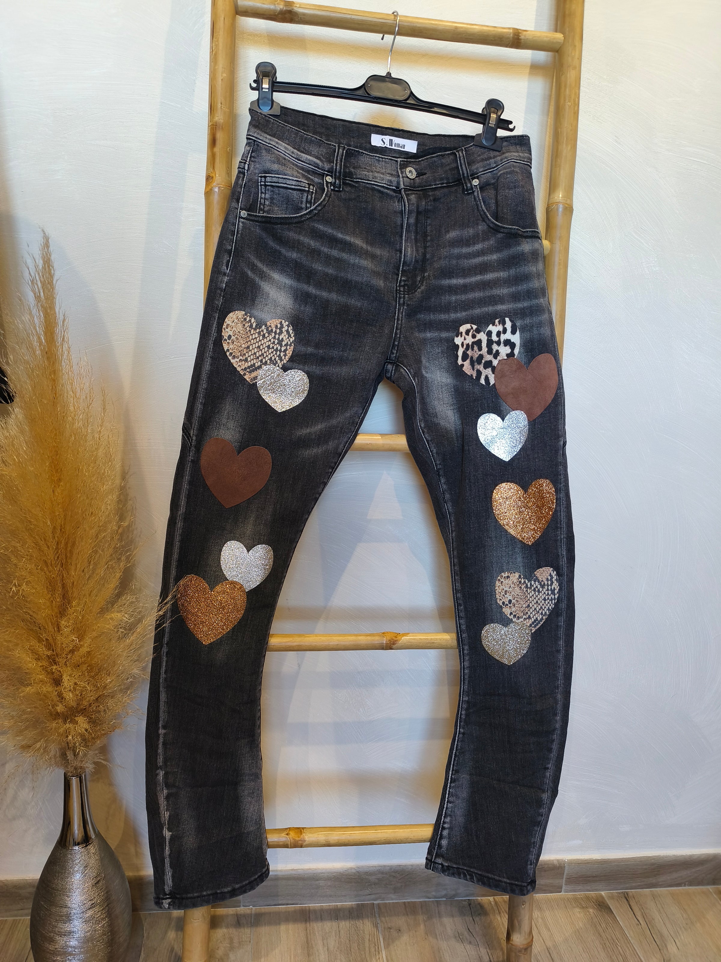 • Jean Noir Délavé à Empiècements Coeurs rock et bohème chic